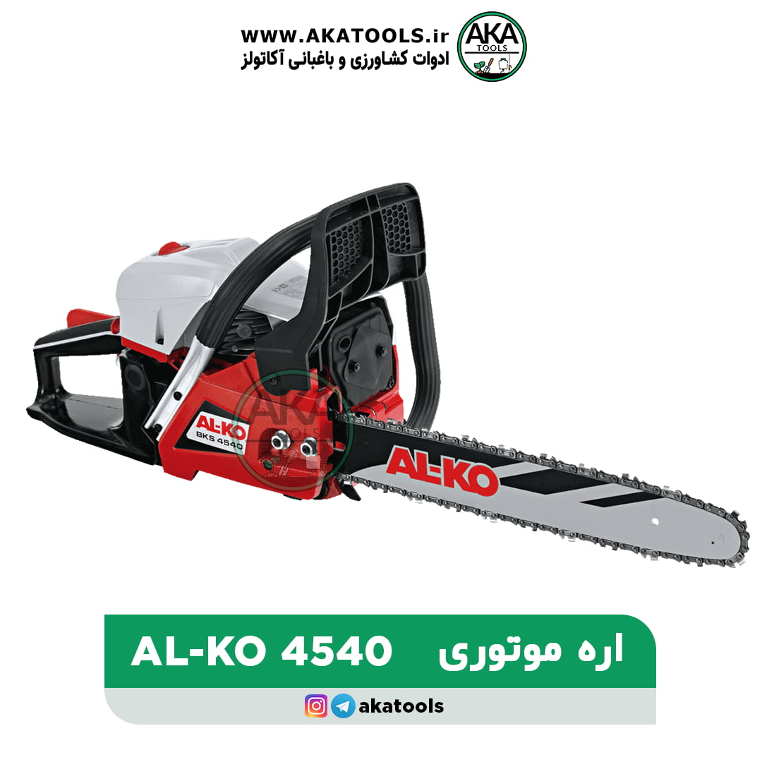 اره موتوری ALKO 4540 با تیغه 40 سانتی و موتور 2.3 اسب بخار تولید شده است که تیغه و زنجیر آن ساخت شرکت اورگان آمریکا می باشد و یک اره ایده آل برای کسانی است که دنبال اره موتوری با وزن مناسب هستند که حتی پس از کارکرد طولانی باعث خستگی کاربر نمی شود. همچنین اره های آلکو به دلیل وجود سیستم لرزش گیر مانع از انتقال لرزش به دست کاربر می شود. اره های آلکو دارای سیستم روغن کاری اتوماتیک زنجیر می باشند که دیگر نیازی به روغن کاری توسط کاربر نمی باشد.
